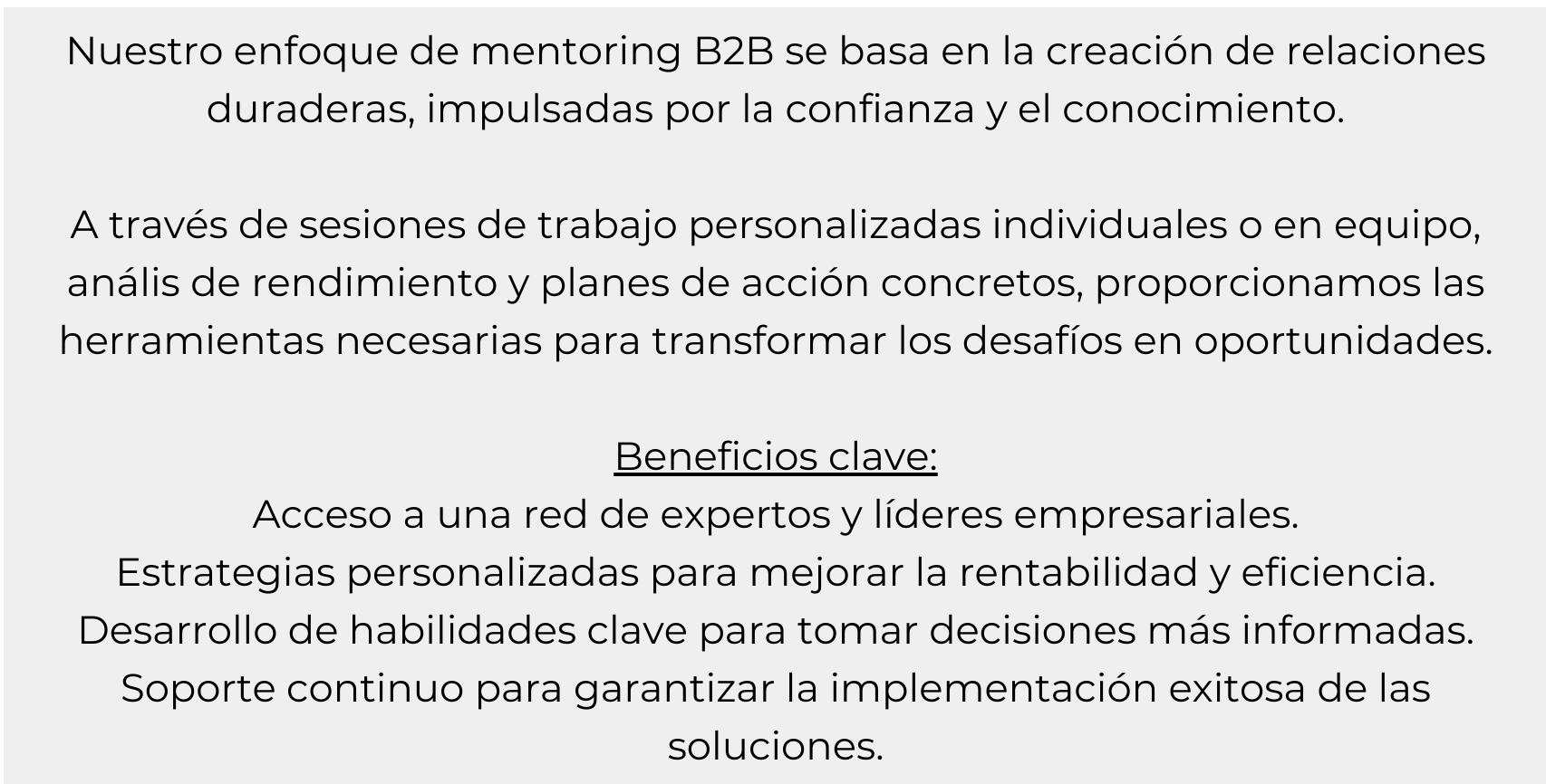Nuestro servicio de mentoring B2B está diseñado para acompañar a empresas de todos los tamaños en su camino hacia el crecimiento sostenible, la innovación y la excelencia operativa.
